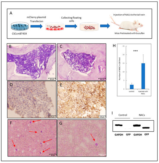 NACs were injected into the tail vein of Balb/c nude mice to assess the potential of clonogenicity in vivo and the engraftment of NACs. Before the injection, CSCcmBT549 cells were transfected with a plasmid expressing mCherry and stable transfectants were selected. Transfected CSCcmBT549 cells expressed both GFP and mCherry (Supplementary Figure S1A–C). However, the GFP expression was lost when the cells differentiate, since Nanog is a stemness marker. They expressed mCherry, which enabled the tracking of daughter cells derivate from CSCcmBT549 cells (Supplementary Figure S1D–F). The mice that were conditioned with busulfan were injected with two doses of NACs. Four weeks after injection, the cell suspensions obtained from the bone marrow (BM) and the spleen showed red fluorescent cells (Supplementary Figure S1J–L,P–R). The engraftment of NACs and the presence of NACs in the mouse BM were further confirmed by immunohistochemical staining with antibody against mCherry, which showed strong positive staining of BM sections when compared with those in mice that were injected with PBS as controls (Figure 5D,E). Although the mCherry positive cells were detected in BM cells after isolation while using fluorescence microscope and by immunohistochemical staining of BM sections, there was a difference regarding the number of positive cells depending on the method used to detect cells. It seemed that the number of mCherry positive cells in isolated cells that were detected by fluorescence microscope is less than those in the BM sections that were stained while using mCherry antibody (Figure 5E and Supplementary Figure S1L). Notably, the counting of 20 random fields of peripheral blood smears stained with Wright–Giemsa showed that the number of white blood cells (WBC) was significantly higher in mice that were injected with NACs than in controls injected with PBS (Figure 5F–H). Moreover, the PCR reaction confirmed the presence of cells that were derived from NACs in the peripheral blood, which have a GFP gene, after four weeks of injection of NACs in the tail vein (Figure 5I). The increasing number of WBCs and the presence of cells derived from NACs may reflect the ability of NACs to restoring and repopulating of WBCs through migration and homing.