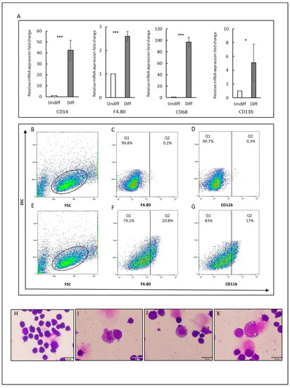 Differentiation potential of CSCs into macrophages. (A) Gene expression levels of macrophage markers (F4/80, CD11b, CD14, and CD68). The gene expression levels normalized by GAPDH expression levels were relatively compared between the cells with/without stimulation of differentiation by IL3 and SCF. * p ≤ 0.05; *** p ≤ 0.001. Diff: differentiated cells, Undiff: undifferentiated cells. (B–G) Flow cytometry analysis for F4.80 and CD11b. (B–D) Cells without stimulation of differentiation. (E–G) Cells with stimulation of differentiation. (B,E) FSC and SSC distribution of gated cells. (C,F) F4.80 and (D,G) CD11b. Each result is shown as a representative of at least three independent experiments. (H–K) Representative images for CSC smears stained with Wrights–Giemsa. (H) For control and (I,G,K) Cell smears after differentiation showing irregular shape with pseudopods (I,K), cytoplasmic vacuolization (k), and lobed (I,K), or Ovid nucleus (J). Scale bars represent 16 μm.