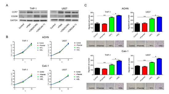 Differentiation of THP-1 and U937 cells and their effects on ACHN and Caki-1 cells. (A) western blotting of M1-marker, CCR7, and M2-marker, CD206 in THP-1 and U937 cells with no treatment (control), treated with 100 ng/mL of phorbol 12-myristate 13-acetate (PMA) and conditioned medium (CM) from ACHN and Caki-1 cells following PMA. THP-1 and U937 cells (2.5 × 105 cells/mL) were treated with PMA for 24 h for M1-type-like (M1L) status. After PMA was removed, cells were exposed to CM of ACHN and Caki-1 cells for 4 days at 37 °C in a humidified atmosphere of 5% CO2 for M2-type-like (M2L) status. (B) Proliferation assay of ACHN and Caki-1 cells alone (control), co-cultured with THP-1 and U937 cells or M1L- and M2L macrophages. ACHN and Caki-1 cells (1 × 105 cells/well) were placed into the lower compartment in 6-well plates, and parental and differentiated THP-1 or U937 cells were placed on the inserts. After co-culture for 24–48 h, ACHN and Caki-1 cells were harvested and the cells were counted. (C) parental and differentiated THP-1 or U937 cells were seeded in the lower compartment (no cells were seeded as control) of a 24-well plate, ACHN and Caki-1 cells were placed in the insert, and after 12 h, the cells migrated through the lower membrane were stained with crystal violet, photographed, and counted. Data are means ± SEM. All experiments were performed in triplicate. No significant difference between groups in which t-test performed was detected by f-test. * p < 0.05, ** p < 0.01.