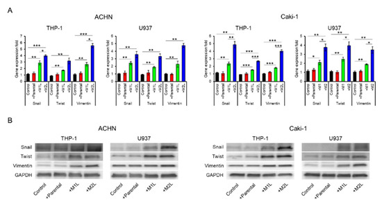 Expression of epithelial–mesenchymal transition (EMT) markers in ACHN and Caki-1 cells co-cultured with parental and differentiated THP-1 or U937 cells. (A) mRNA was extracted from ACHN and Caki-1 cells after co-culture (single culture as control) for 12 h, quantified, and analyzed by RT-qPCR for epithelial–mesenchymal transition markers. (B) Protein was extracted from ACHN and Caki-1 cells after co-culture (single culture as control) for 12 h and evaluated by western blotting. Data are means ± SEM. All experiments were performed in triplicate. No significant difference between groups in which t-test performed was detected by f-test. * p < 0.05, ** p < 0.01, and *** p < 0.001.