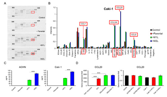 Chemokines were assayed using CM collected from Caki-1 co-cultured with parental, M1L-, and M2L-THP-1 cells using a Human Chemokine Array Kit (ARY017, R&D Systems), following the manufacturer’s instructions.