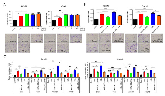 Effect of CCL20 on migration ability of ACHN and Caki-1 cells. (A) ACHN or Caki-1 cells were placed on inserts in 24-well plates with or without 0 (controls) −10 ng/mL human recombinant CCL20 and cell migration was assayed at after 12 h. (B) ACHN or Caki-1 cells were placed on inserts in 24-well plates and co-cultured with M1L- and M2L-THP-1 cells (ACHN or Caki-1 cells alone as controls) with or without anti-CCL20 neutralizing antibody (CCL20 ab) and migration was assayed after 12 h. (C) mRNA was extracted from ACHN and Caki-1 cells after co-cultured with M1L- and M2L-THP-1 cells (ACHN or Caki-1 cells alone as controls) with or without CCL20 ab for 12 h, quantified, and analyzed by RT-qPCR for epithelial–mesenchymal transition markers and CCR6. Data are means ± SEM. All experiments were performed in triplicate. No significant difference between groups in which t-test performed was detected by f-test. * p < 0.05, ** p < 0.01, and *** p < 0.001.