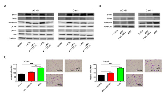 We have previously shown that chemokines increase cell migration and invasiveness via Akt activation in prostate cancer [10,11,12]. Thus, Akt, which is a well-known cancer-cell-activating pathway, was focused on as a potential downstream effector of the CCL20-CCR6 axis in the migration of RCC cells. Administration of anti-CCL20 neutralizing antibody reduced macrophage-like cell-induced upregulation of EMT markers and phosphorylation of Akt in RCC cells (Figure 5A). Interestingly, CCR6 was also controlled by its ligand, CCL20. When Akt inhibitor AZD5363 was added to M2L-THP-1 and M2L-U937 cells, the increase of EMT markers was suppressed (Figure 5B). To determine whether activation of Akt is responsible for the increased migratory capacity of RCC cells, AZD5363 was used in the migration assay of RCC cells. AZD5363 could significantly suppress RCC cell migration co-cultured with macrophage-like cells (Figure 5C). These results clearly indicate that Akt is a downstream target of the CCL20-CCR6 axis and an important pathway in promoting RCC cell migration.