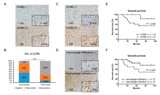 Immunohistochemical staining of CCR6 and CD68 using 42 RCC tissue samples. (A) Normal (non-cancer) areas in RCC tissues were stained with anti-CCR6 antibody. Negative and positive staining samples of normal area were shown (the upper and lower panel, respectively). (B) The distribution of CCR6 staining intensity in normal and tumor area showed stronger expression of CCR6 in tumor area than in normal area. The χ2-test for trend was performed. (C) Tumor area of RCC tissues was stained with anti-CCR6 antibody. The upper and lower panel shows a negative and positive staining sample, respectively. (D) Tumor area of RCC tissues was stained with anti-CD68 antibody to detect infiltrating macrophages into RCC tumor microenvironment. The upper and lower panel shows a negative and positive staining sample, respectively. (E) Overall survival of CCR6 positive (n = 27) and negative (n = 15) patients are shown. (F) Overall survival of CD68 positive (n = 15) and negative (n = 27) patients are shown. Kaplan–Meier curves were used to estimate survival distributions and the log-rank test was used to analyze survival differences. * p < 0.05 and ** p < 0.01.