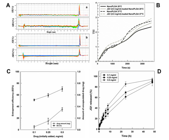 Evaluation of the physical stability of the various nanoformulations. (A) Transmittance (ΔT) and backscattering (ΔBS) profiles of (a) empty PLGA nanoparticles and (b) nanosystems prepared with JQ1 (0.5 mg/mL) using Turbiscan Lab. Results representative of three independent experiments are shown. (B) Turbiscan Stability Index (TSI) profiles of PLGA nanoparticles as empty formulation or prepared with JQ1 (0.5 mg/mL) as a function of time and temperature. (C) Entrapment efficiency of JQ1 in PLGA nanoparticles as a function of the drug concentration used. (D) Release profile of JQ1 from PLGA nanoparticles as a function of the entrapped drug concentration and incubation time. Values represent the mean of three different experiments ± SD.