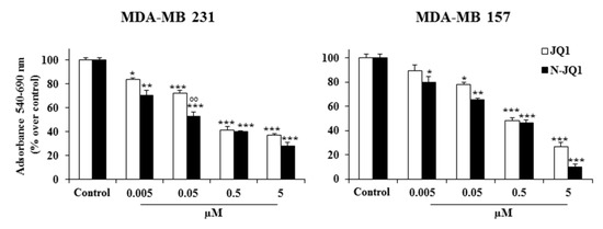 Treatment for 48 h with the biocompatible nanoformulation containing JQ1 (N-JQ1) at various concentrations (0.005, 0.05, 0.5 and 5 µM) determined a significant reduction in viability of both MDA-MB 231 and MDA-MB 157 cells (Figure 2). In particular, a decrease of approximately 50% vs. untreated cells was observed at the 0.05 µM concentration of N-JQ1 in MDA-MB 231 cells, with a significantly stronger effect compared with JQ1. Similar effects were detected in MDA-MB 157 cells, but with an EC50 of 0.5 µM (Figure 2).