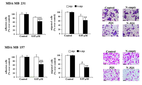 Treatment with N-JQ1 0.05 µM also induced a significant reduction in adhesion and migration of MDA-MB 231 (~40% and ~50%, respectively) and MDA-MB 157 (~40% and ~70%, respectively) cells compared to the vehicle treatment (Figure 3). Again, in MDA-MB 231 cells, the effects of N-JQ1 were stronger than those of JQ1 (Figure 3).