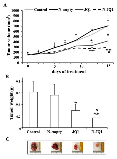 As shown in Figure 4A, tumor growth was decreased in the mice treated with JQ1. Interestingly, a more significant regression of tumor growth was observed in the mice treated with N-JQ1 (Figure 4A). At the end of treatments, tumors of the mice treated with N-JQ1 presented lower weights and sizes than the group of controls or the one treated with the empty nanoparticles (N-empty). A significant difference was also noted between the groups treated with N-JQ1 versus those receiving JQ1 (Figure 4B,C).