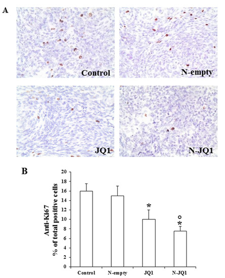 (A) A representative image of immunostaining for Ki67 in tumors of each group of animals, treated as described in Methods (200× magnification). (B) The percentage of positive over total stained cells for Ki67 in tumors slices are shown in bar graphs.JQ1, JQ1 (20 mg/kg) diluted in PBS + 5% PEG 400 + 5% TWEEN; N-JQ1, nanoparticles containing JQ1 20 mg/Kg; N-empty, unloaded nanoparticles; Control, untreated mice. Values are expressed as means ± SD. * p < 0.05 vs. Control; ° p < 0.05vs. JQ1.