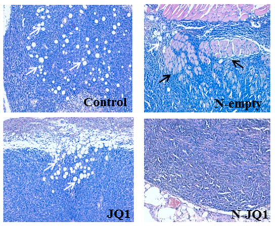 Tumor infiltration of tumor-surrounding tissues. Analyses of tumor tissues by hematoxylin and eosin staining of the four groups of animals after treatment with JQ1 (20 mg/kg) diluted in PBS + 5% PEG 400 + 5% TWEEN (JQ1), unloaded nanoparticles (N-empty) or nanoparticles containing JQ1 20 mg/Kg (N-JQ1). Black and white arrows indicate muscle and fat infiltrations, respectively. Magnification 100×.