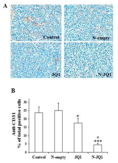 Immunohistochemical analysis of CD31 expression. (A) Representative images of immunostaining for CD31 in tumors of the four groups of animals treated as described in Methods (200× magnification). (B) The percentage of total positive cells for CD31 tumors are shown in bar graphs. JQ1, JQ1 (20 mg/kg) diluted in PBS + 5% PEG 400 + 5% TWEEN; N-JQ1, nanoparticles containing JQ1 20 mg/Kg; N-empty, unloaded nanoparticles; Control, untreated mice. Values are expressed as means ± SD. * p < 0.05, *** p < 0.001 vs. control; ° p < 0.05 vs. JQ1.