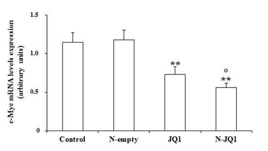 c-Myc mRNA levels in tumor tissues. Control, untreated mice JQ1; N-empty, unloaded nanoparticles; JQ1 (20 mg/kg) diluted in PBS + 5% PEG 400 + 5% TWEEN; N-JQ1, nanoparticles containing JQ1 20 mg/Kg. Values are expressed as means ± SD. * p < 0.05 vs. control, ** p < 0.01 vs. N-empty; ° p < 0.05 vs. JQ1.