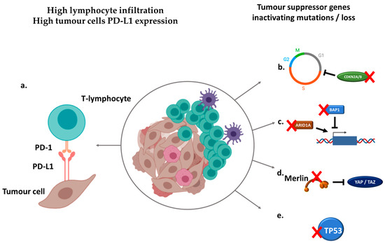 Immunologic and genomic hallmarks of sarcomatoid dedifferentiation in renal cell carcinoma (RCC). (a) Sarcomatoid renal cell carcinomas (sRCCs) are associated with higher programmed cell death ligand-1 (PD-L1) expression on tumor cells and higher lymphocyte infiltration. (b) Recurrent alterations of cell cycle inhibitors CDKN2A/B promote cell proliferation and epithelial/mesenchymal transition. (c) Loss of chromatin-remodeling genes BAP1 and ARID1A induce genome-wide expression deregulation. (d) Loss of Merlin, encoded by the NF2 gene, promotes Hippo pathway activation, leading to growth and aggressiveness. (e) Loss of tumor suppressor gene TP53 favors survival and proliferation.
