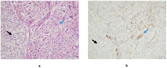 (a) Interface between areas of classical clear-cell carcinoma (black arrow) and its sarcomatoid component (blue arrow), Hematoxylin Eosin staining. (b) A higher density of tumor-infiltrating mononuclear inflammatory cells expressing PD-L1 is observed in the sRCC area compared to the clear-cell RCC one (monoclonal mouse antibody clone 22C3, hematoxylin counter staining). In this case, there is no PD-L1 expression on tumor cells.