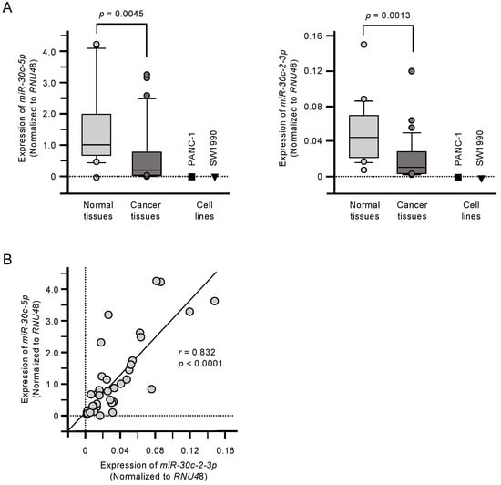 Downregulation of miR-30c-5p and miR-30c-2-3p in pancreatic ductal adenocarcinoma (PDAC). (A) Expression levels of miR-30c-5p and miR-30c-2-3p in PDAC clinical specimens and cell lines (PANC-1 and SW1990). Data were normalized to the expression of RNU48. (B) Spearman’s rank tests showed positive correlations between the expression levels of miR-30c-5p and miR-30c-2-3p in clinical specimens.