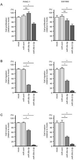 Tumor-suppressive roles of miR-30c-5p and miR-30c-2-3p in PDAC cell lines. (A) Cell proliferation was measured by the XTT assay. Data were collected 72 h after miRNA transfection (* p < 0.0001). (B) Cell migration was assessed with a membrane culture system. Data were collected 48 h after seeding the cells into chambers (* p < 0.0001). (C) Cell invasion was determined 48 h after seeding miRNA-transfected cells into chambers using Matrigel invasion assays (* p < 0.0001).
