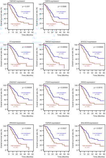 Clinical significance of miR-30c-5p and miR-30c-2-3p target genes by The Cancer Genome Atlas (TCGA) database analysis. Among the putative target genes of miR-30c-5p and miR-30c-2-3p regulation in PDAC cells, high expression levels of 18 genes (YWHAZ, CBFB, F3, TMOD3, NFE2L3, ENDOD1, ITGA3, RRAS, PRSS23, TOP2A, BHLHE40, CHST11, IL1RAP, DIEXF, CORO1C, RTP4, AP1S3, and LRRFIP1) were found to significantly predict worse prognoses in patients with PDAC (p < 0.01). Kaplan–Meier curves of the 5-year overall survival rate for each gene are presented.
