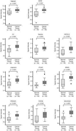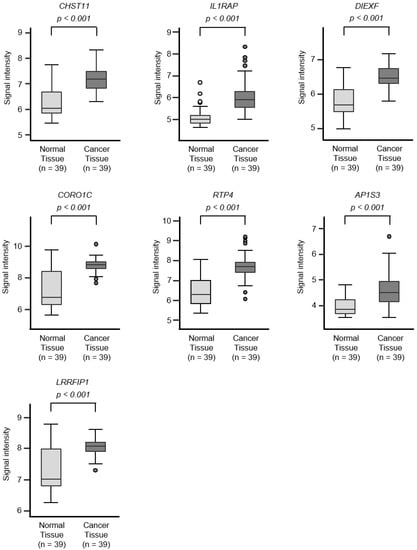 To screen for genes regulated by miR-30c-5p and miR-30c-2-3p, we obtained RNA microarray data for PANC-1 and SW1990 cells transfected with miR-30c-5p and miR-30c-2-3p. These data were combined with gene expression datasets from Gene Expression Omnibus (GEO; GSE15471) and data obtained from the TargetScanHuman database (release 7.2), which provides data on the putative targets of each miRNA. A total of 216 genes were identified as putative oncogenic targets of miR-30c-5p and miR-30c-2-3p (51 genes for miR-30c-5p and 165 genes for miR-30c-3p; Table S2). Among these 216 genes, the expressions of 18 genes showed statistically significant correlations with the 5-year overall survival rates of patients with PDAC (p < 0.01; Table 1 and Figure 3). The expression levels of these target genes were reevaluated using the GEO dataset, and all the genes were confirmed to be upregulated in PDAC tissues compared to normal pancreatic tissues (Figure 4). We also validated the gene expression levels of these 18 genes using another expression dataset (GSE28735). The analysis data is shown in Figure S1. Two datasets revealed that the expressions of these genes were upregulated in cancerous tissues.
