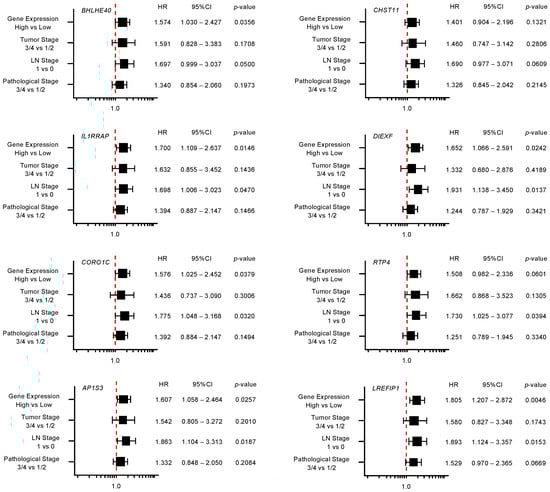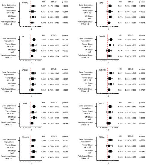 Forest plot of multivariate analysis of 18 target genes (that predicted 5-year survival) of miR-30c. The multivariate analysis determined that the expression levels of 10 genes (YWHAZ, F3, TMOD3, NFE2L3, ENDOD1, ITGA3, RRAS, PRSS23, TOP2A, and LRRFIP1) were independent prognostic factors for 5-year overall survival after the adjustment for tumor stage, lymph node metastasis, and pathological stage (p < 0.01).