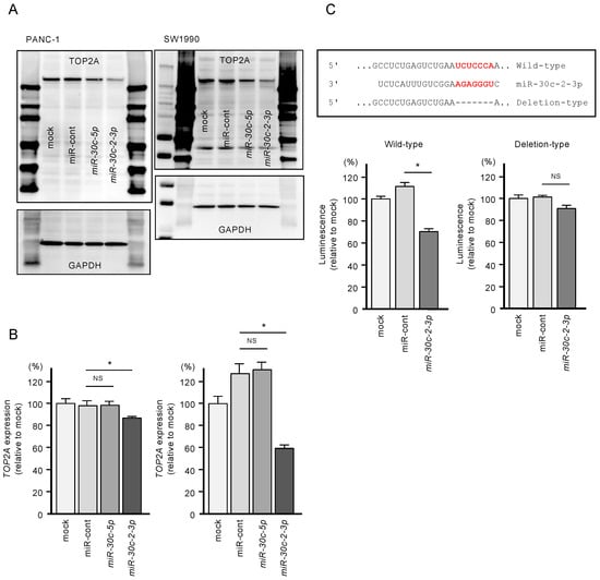 In addition, to validate whether miR-30c-2-3p directly binds to TOP2A in PDAC cells, we performed dual-luciferase reporter assays. We designed plasmid vectors encoding the partial sequence of the 3′-UTR of TOP2A. One of them included the predicted miR-30c-2-3p target site (“wild-type”), and the other lacked the target site (“deletion-type”; Figure 6C). The luciferase activity was significantly decreased following co-transfection of miR-30c-2-3p and a vector carrying the wild-type 3′-UTR of TOP2A. In contrast, no decrease in luminescence was observed following transfection of the deletion-type vector (Figure 6C). These findings indicate that miR-30c-2-3p directly binds to the 3′-UTR of TOP2A.