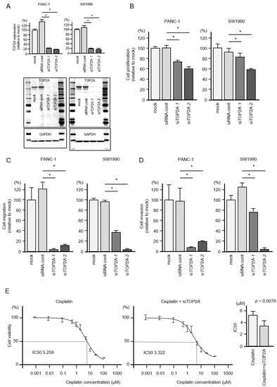 Effects of TOP2A knockdown in PDAC cells. (A) Validation of TOP2A knockdown efficiency in siRNA-transfected PDAC cells. The mRNA expression levels of TOP2A were significantly reduced by miR-30c-2-3p transfection into PANC-1 and SW1990 cells. The protein expression levels of TOP2A were significantly reduced by transfection of two siRNAs (siTOP2A-1 and siTOP2A-2) into PANC-1 and SW1990 cells (measured 72 h after transfection). Images of whole Western blot gels are shown. GAPDH was used as an internal control. (B) Cell proliferation was measured by the XTT assay. Data were collected 72 h after siRNA transfection (* p < 0.0001). (C) Cell migration was measured using a membrane culture system. Data were collected 48 h after seeding the cells into chambers (* p < 0.0001). (D) Cell invasion was determined 48 h after seeding miRNA-transfected cells into chambers using Matrigel invasion assays (* p < 0.0001). (E) In PDAC cells, siTOP2A increased the sensitivity to the anticancer drug cisplatin. Half maximal inhibitory concentration (IC50) values were worked out by using GraphPad Prism8 software.