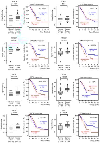 In the GSE15471 dataset, the expression of the genes (except HDAC2) was significantly elevated in PDAC cancer tissues compared to normal tissues (p < 0.01; Figure 8). Furthermore, Kaplan–Meier survival analysis of the eight genes revealed that HMGB2 expression and SP1 expression were significantly predictive of the 5-year survival rate of patients with PDAC (p < 0.01; Figure 8).