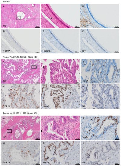 The expressions of TOP2A, HMGB2, and SP1 protein were evaluated in PDAC clinical specimens by immunohistochemistry. The overexpression of the three proteins in the nuclei of cancer cells from PDAC clinical specimens was detected (Figure 9). The overexpression of these proteins (TOP2A, HMGB2, and SP1) was not observed in noncancerous tissues. Ki-67 was used as a marker for cell proliferating cells.