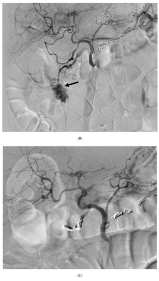 - Fujii, Y.; Shimada, H.; Endo, I.; Yoshida, K.; Matsuo, K.; Takeda, K.; Ueda, M.; Morioka, D.; Tanaka, K.; Togo, S. Management of massive arterial hemorrhage after pancreatobiliary surgery: Does embolotherapy contribute to successful outcome? J. Gastrointest. Surg. 2007, 11, 432–438. [Google Scholar] [CrossRef]
