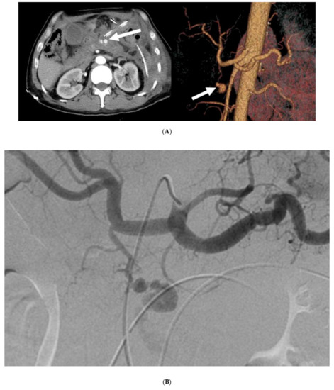 - Sato, N.; Yamaguchi, K.; Shimizu, S.; Morisaki, T.; Yokohata, K.; Chijiiwa, K.; Tanaka, M. Coil embolization of bleeding visceral pseudoaneurysms following pancreatectomy: The importance of early angiography. Arch. Surg. 1998, 133, 1099–1102. [Google Scholar] [CrossRef] [PubMed]