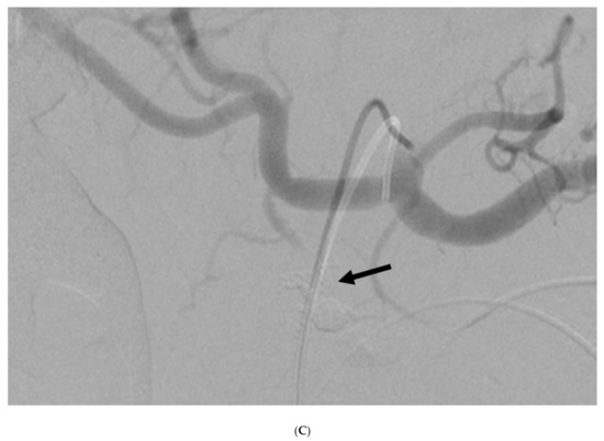 - Izaki, K.; Yamaguchi, M.; Kawasaki, R.; Okada, T.; Sugimura, K.; Sugimoto, K. N-butyl cyanoacrylate embolization for pseudoaneurysms complicating pancreatitis or pancreatectomy. J. Vasc. Interv. Radiol. 2011, 22, 302–308. [Google Scholar] [CrossRef] [PubMed]