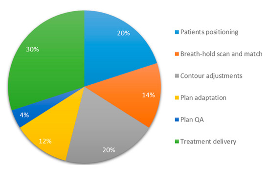 Pie-chart of the average duration of the different components of breath-hold gated adaptive MR-guided radiotherapy with an average time per fraction of 45 min.