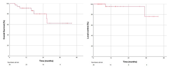 Kaplan-Meier plots for overall survival (left) and local control (right).