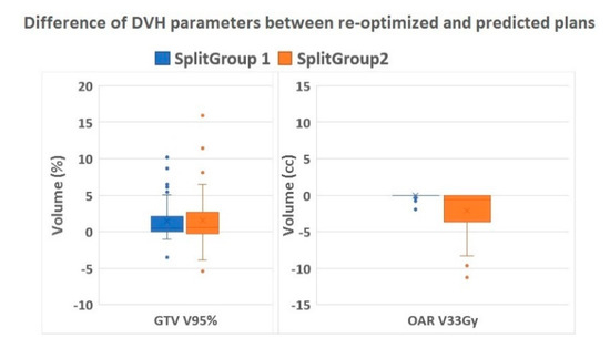 Difference of DVH parameters. Boxplots showing the relative volume difference in GTV V95% (%) and absolute difference in OAR V33Gy (cc) of the re-optimized compared to the predicted plans stratified for Split group 1 (re-optimization not needed) and 2 (re-optimization needed). Abbreviations: DVH = dose volume histogram, GTV = gross target volume, OAR = organs at risk.
