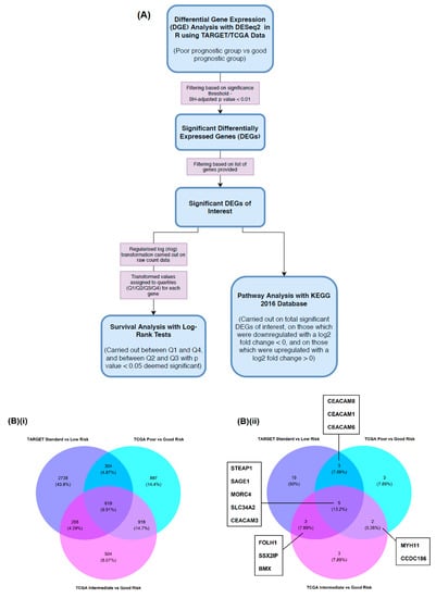 Overview of the analytical workflow and identification of differentially expressed genes (DEGs) that overlap between subgroup comparisons. (A) DESeq2 was used to perform differential gene expression (DGE) analysis using mRNA-Seq raw counts for various poor prognostic versus good prognostic group comparisons within Therapeutically Applicable Research to Generate Effective Treatments (TARGET), and The Cancer Genome Atlas (TCGA) patient datasets. DGE results were filtered (Benjamini–Hochberg (BH)-adjusted p value < 0.01) to yield significant DEGs. Where genes of interest (GOI) were found to be significantly differentially expressed, raw count data within a corresponding subgroup comparison was transformed and expression levels of GOI across all patients in the comparison were assigned to a quartile (Q1/Q2/Q3/Q4). Log-rank tests were carried out between patients of Q1 and Q4 expression, and of Q2 and Q3, with p value < 0.05 deemed significant. Pathway analysis was also carried out using the Kyoto Encyclopedia of Genes and Genomes (KEGG) 2016 Database on total significantly differentially expressed GOI, on those considered as downregulated (log2 fold change < 0), and those considered as upregulated (log2 fold change > 0); (B) Venn diagrams provide a visual summary of (i) all genes and (ii) GOI that were identified as significantly differentially expressed when comparing TARGET and TCGA subgroups.