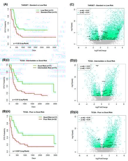 DGE analysis. Pairwise comparisons of event-free survival (EFS) of (A) TARGET patients by standard versus low risk (p = 0.02), and (B) TCGA patients by (i) intermediate versus good risk (p = 0.01) and (ii) poor versus good risk (p = 0.007) subgroups. All p values derived from log-rank analysis. Volcano plots represent the genes that were differentially expressed by p > 0.01 (grey dots) or p < 0.01 (green dots) when comparing (C) TARGET patients by standard versus low risk, and (D) TCGA patients by (i) intermediate versus good and (ii) poor versus good risk subgroups. Names and black dots indicate the position of antigens listed as GOI when studying gene expression.