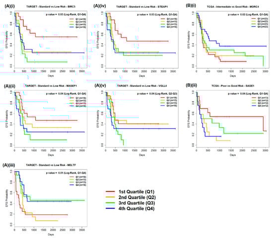 Log-rank test results were significant (p value < 0.05) for five significantly differentially expressed GOI (Table 2). Significant differences in the EFS of patients were found when comparing standard and low risk subgroups, and Q1 and Q4 expression levels of the protein coding gene Baculoviral Inhibitor Apoptosis Proteins (IAP) Repeat Containing 5 (BIRC5) (p = 0.03; Figure 3A(i)), melanoma antigen family F1 (MAGEF1) (p = 0.04; Figure 3A(ii)), Melanotransferrin (MELTF) (p = 0.01; Figure 3A(iii)) and STEAP1 (p = 0.03; Figure 3A(iv)) and when comparing Q2 and Q3 expression levels of Vestigial-like 4 (VGLL4) across standard and low risk subgroups (p = 0.04; Figure 3A(v)). Higher EFS probabilities were observed over time in patients who had Q1 expression levels of BIRC5, MAGEF1, and STEAP1 than with patients who had Q4 expression levels, whereas, with MELTF, higher EFS probabilities were observed over time with patients who had Q4 expression levels than with patients who had Q1 expression levels. With VGLL4, higher EFS probabilities were observed over time with patients who had Q2 expression levels than with patients who had Q3 expression levels.