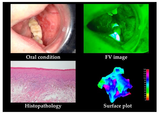 In subjective evaluations, oral conditions and FV images were compared to evaluate FVR, FVA or FVL in lesions (Figure 7A,B) [57,58]. Image processing analysis was performed on the FV images using Image J software version 1.5 (National Institutes of Health, Bethesda, Maryland, USA) [59,60]. Regions of interest (ROIs) for the lesion and control area were established in FV images [15,16,17].