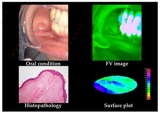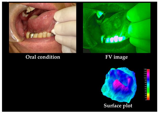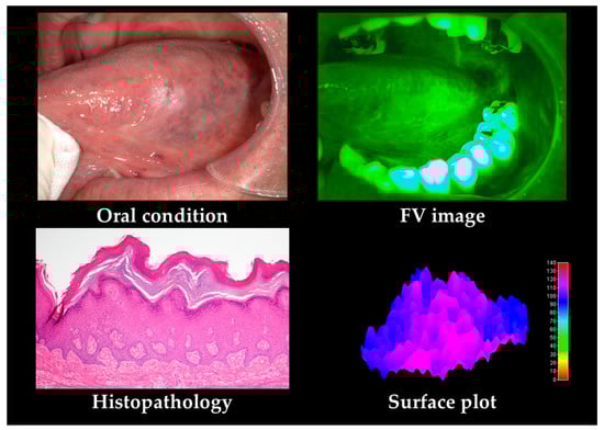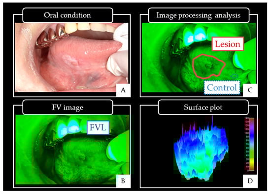 The ROI of the lesion was defined as the area of FVL. The control ROI was set at a distance away in the same sub-site of the oral cavity in normal mucosa in front of the lesion without FVL and oral mucosal lesions (Figure 7C). The state of the lesion ROI was expressed in the surface plot, and color mapping was performed for the lesion ROI (Figure 7D). In subjective evaluation, we defined a positive case as FVL and a negative case as only FVA or FVR by two or more screenings using the surface plot as a reference [15,16,17]. The FVL rate was calculated. Sensitivity and specificity were calculated as follows; [sensitivity = (FVL positive cases of oral cancers/all cases of oral cancers) × 100%], [specificity = (FVL negative cases without oral cancers/all cases without oral cancers) × 100%].
