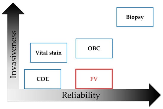 The concept of oral cancer screening in terms of invasiveness and reliability. Biopsy is the gold standard method for oral cancer screening. Conventional oral examination (COE) and FV are non-invasive methods, and FV is of high reliability.