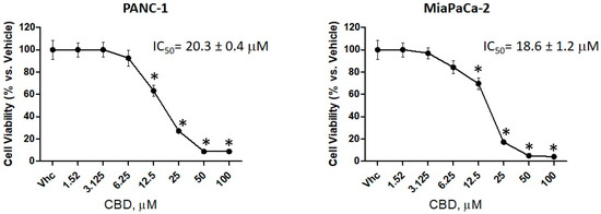 Cannabidiol (CBD) induced cytotoxicity in PDAC cell lines. Cell viability was determined by 3-[4,5-dimethylthiazol-2-yl]-2,5 diphenyl tetrazolium bromide (MTT) assay. PANC-1 and MiaPaCa-2 cells were treated for 72 h with different concentrations of CBD (up to 100 µM), in daily administration. Data shown are expressed as mean ± SE of three separate experiments. * p < 0.05 treated vs. vehicle.