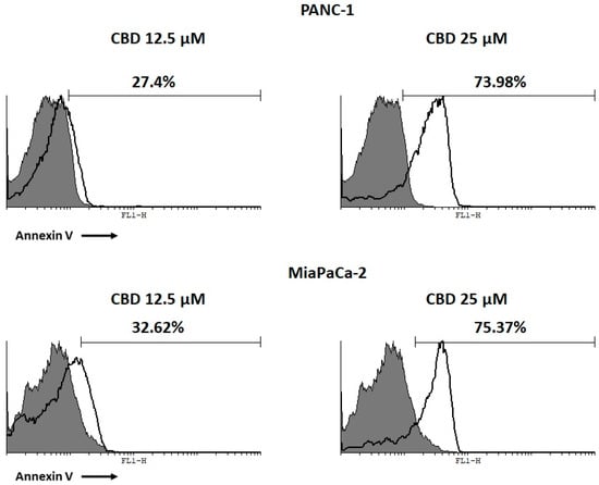 To assess cell death, FITC-conjugated Annexin V and Propidium Iodide (PI) staining and cytofluorimetric analysis were used. After 48 h of daily treatment with CBD (12.5–25 μM), it was observed that CBD induces an increased percentage of cells undergoing apoptosis compared to control, in both cell lines. PANC-1 and MiaPaCa-2 showed a significant increase in apoptotic cell death with CBD 25 μM compared to 12.5 μM (Figure 2).