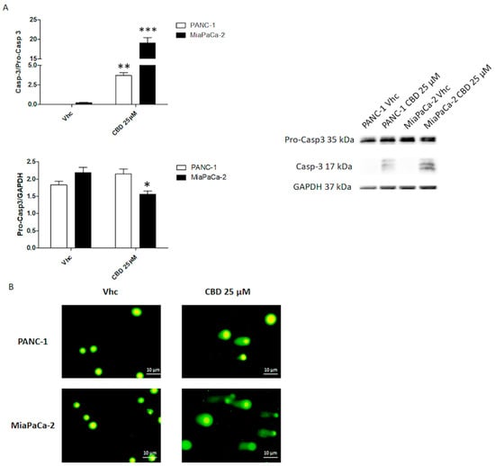 CBD induced apoptotic cell death in PDAC cell lines. PDAC cell lines were treated with CBD for 48 h. (A) Western blot analysis and densitometric quantification of Casp-3 protein levels. Pro-Casp3 densitometric values were normalized to Glyceraldehyde 3-phosphate dehydrogenase (GAPDH) used as loading control, Casp-3 densitometric values were normalized to Pro-casp3. Blots are representative of one of three separate experiments, * p < 0.05, ** p < 0.01, *** p < 0.001 treated vs. untreated cells. The whole western blot image can be found in Figure S11. (B) Cell damage and DNA fragmentation were determined on PANC-1 and MiaPaCa-2 cells untreated (Vehicle Vhc) and treated with CBD for 48 h by Comet assay (alkaline electrophoresis conditions 20 V for 10 min, image acquisition 10×).