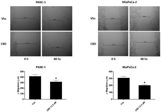 PANC-1 and MiaPaCa-2 cells were seeded onto a 24-well plate at a density of 4 × 104/mL and 2.5 × 104/mL, respectively. When cells were confluent, they were scratched using 10 μL sterile pipette tips, and medium was replaced with fresh medium containing low percentage of serum to minimize cell proliferation and prevent cell detachment and treated with CBD 12.5 μM. Images of wounded areas were taken at 0 h and 48 h. Images acquisition was carried out by a LeitzFluovert FU (Leica Microsystems) microscope. Remaining wound areas were determined using NIH Image J 1.44 software (Research Services Branch (RSB), National Institutes of Health (NIH), Bethesda, MD, USA) three separate distance measurements per well. Analyses were performed in triplicate.