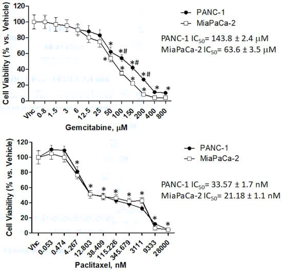 Cytotoxic effect of chemotherapeutic drugs in PDAC cell lines. Cell viability was determined by MTT assay. PANC-1 and MiaPaCa-2 cells were treated for 72 h with different concentrations of gemcitabine (GEM) (up to 800 µM) or paclitaxel (PTX) (up to 28 µM), in single administration. Data shown are expressed as mean ± SE of three separate experiments. * p < 0.05 treated vs. vehicle, # p < 0.05 PANC-1 vs. MiaPaCa-2.