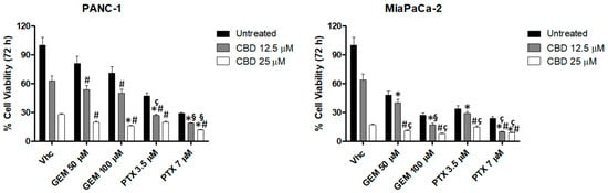In order to evaluate a synergistic effect between CBD and the most common chemotherapeutic drugs used in PDAC treatment, GEM (up to 800 µM) and PTX (up to 28 µM) were tested in both cell lines. The results evidenced that MiaPaCa-2 cells are more sensitive to GEM and PTX than PANC-1 and that PTX shows a higher cytotoxic effect than GEM, in both cell lines (PANC-1 GEM IC50: 143.8 ± 2.4 μM; PTX 33.57 ± 1.2 nM, MiaPaCa-2 GEM IC50: 63.6 ± 3.5 μM; PTX 21.18 ± 1.1 nM) (Figure 5), at 72 h post-treatments.