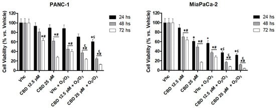 O2/O3 improved CBD cytotoxicity in PDAC cell lines. Cell viability, up to 72 h, was determined by MTT assay. PANC-1 and MiaPaCa-2 cells were treated with O2/O3 and CBD (12.5 and 25 µM) in daily administration. Data shown are expressed as mean ± SE of three separate experiments. * p < 0.05 treated vs. vehicle, # p < 0.05 48, 72 h vs. 24 h, ç p < 0.05 vs. CBD.