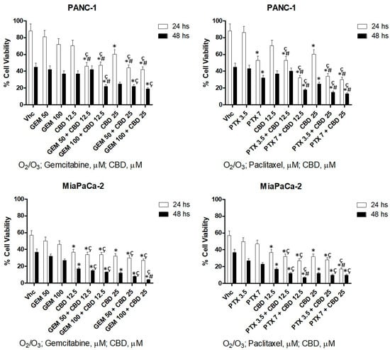 Addition of O2/O3 improves cytotoxic effect of CBD and chemotherapeutic drugs. Cell viability was determined in PDAC cell lines by MTT assay, and the percentage of cell viability was calculated compared with O2/O3 alone. Vhc showed in the graph is O2/O3 alone. O2/O3 conditioned cells were treated for 24 and 48 h with CBD, alone and in combination with different doses of GEM and PTX. Data shown are expressed as mean ± SE of three separate experiments. * p < 0.05 vs. Vhc # p < 0.05 vs. CBD alone, ç p < 0.05 vs. chemotherapeutic drug alone.