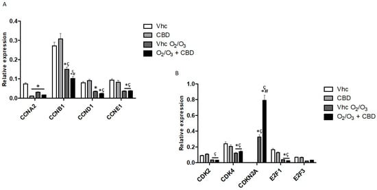 Modulation of cell cycle pathways in PANC-1 cell line. (A) CCNA2, CCNB1, and CCND1, CCNE1 mRNA expression and (B) CDK2, CDK4, CDKN2A, E2F1, and E2F3 mRNA expression was evaluated by qRT-PCR in the PANC-1 cell line, treated with CBD in the presence and absence of O2/O3. Target mRNA levels were normalized for GAPDH expression. Data are expressed as fold mean ± SE. * p < 0.05 vs. Vhc, #,* p < 0.05 vs. Vhc O2/O3, ç p < 0.05 vs. CBD.