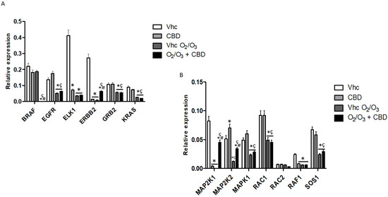 Modulation of Ras pathways in PANC-1 cell line. (A) BRAF, EGFR, ELK1, ERBB2, GRB2, and KRAS mRNA expression and (B) MAP2K1, MAP2K2, MAPK1, RAC1, RAC2, RAF1, and SOS1 mRNA expression was evaluated by qRT-PCR in the PANC-1 cell line, treated with CBD in the presence and absence of O2/O3. Target mRNA levels were normalized for GAPDH expression. Data are expressed as fold mean ± SE. * p < 0.05 vs. Vhc, #,* p < 0.05 vs. Vhc O2/O3, ç p < 0.05 vs. CBD.