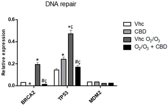 Thanks to Taqman Array we also detected that CBD significantly increases the TP53 gene, which is associated with DNA repair (Figure 12, Figure S8). O2/O3 treatment was effective in increasing BRCA2 and TP53 gene expression with respect to vehicle-treated cells (Figure 12, Figure S8). However, the combination with CBD reduced BRCA2 and TP53 gene expression, restoring the expression of untreated cells (Figure 12, Figure S8).